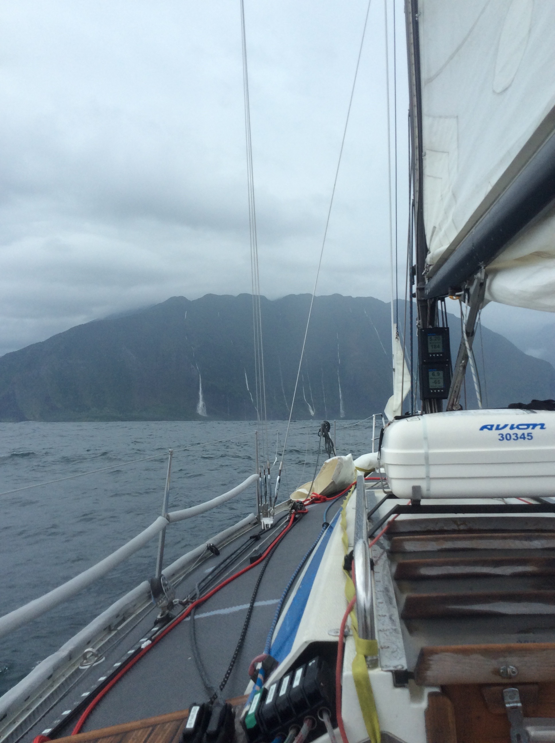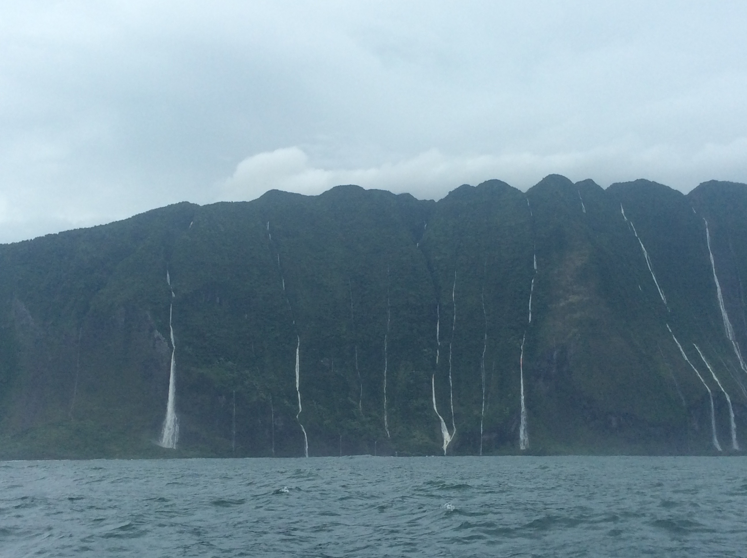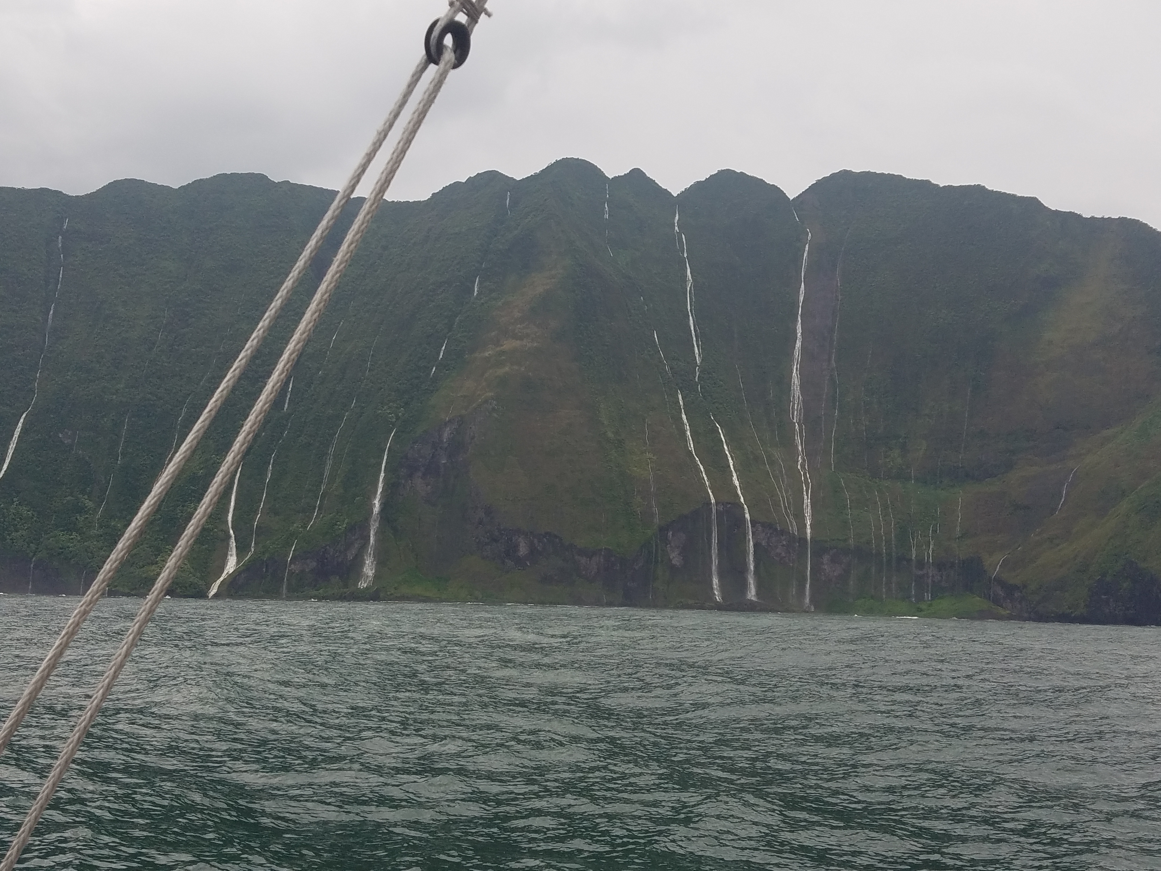 The north coast of Moloki is undeveloped and will probably never be. Once I saw the volcanic structure of the steep 3,000 to 4,000 foot cliffs I understood. Many waterfalls jumped out at us as they were all full of water, flowing at maximum capacity. In one area, we motor sailed in close to get a good look, and could hear the crashing and cascading water. Very exciting.