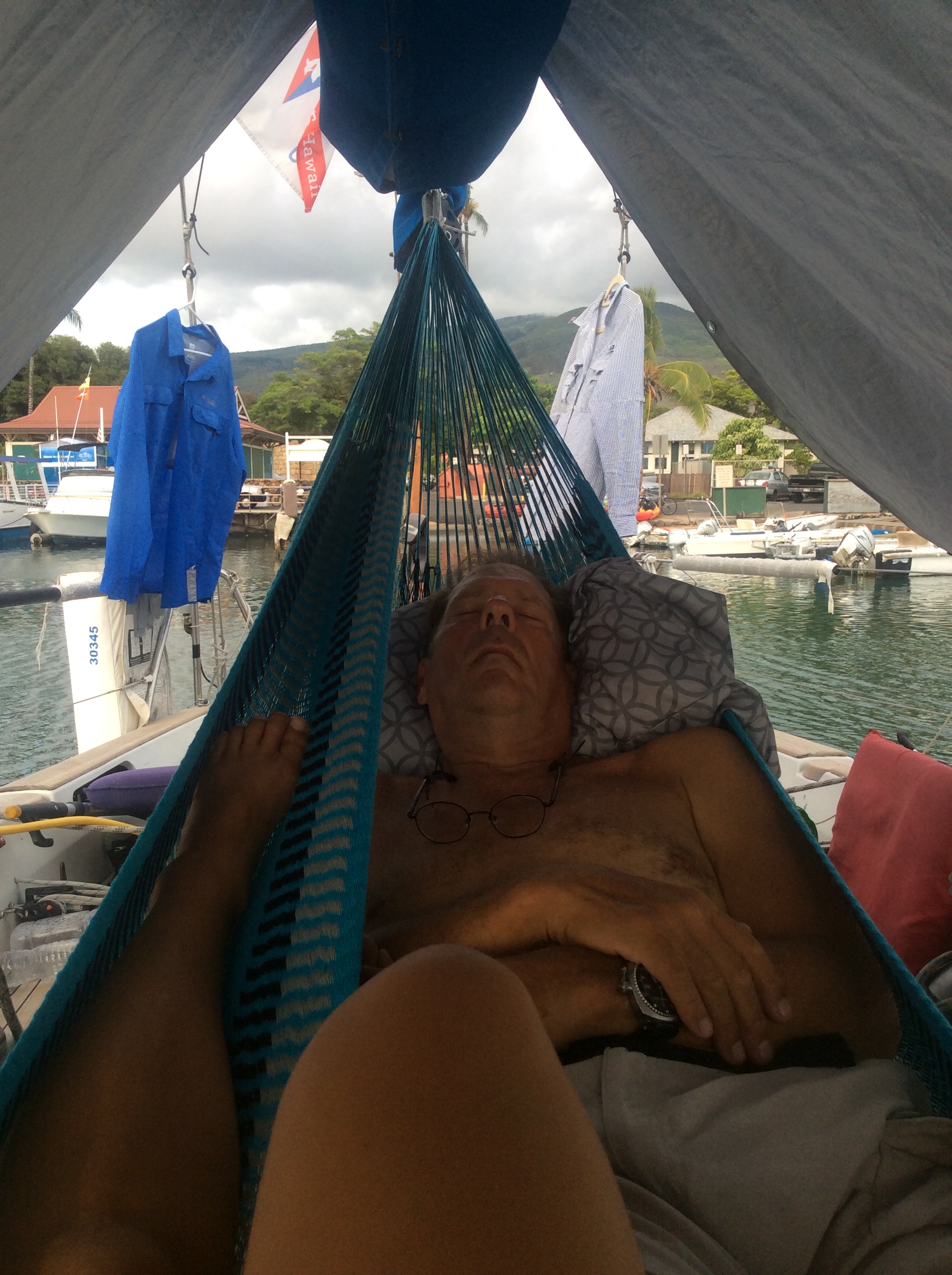 We have been sailing for 2 months, living on a boat, and doing incredible things. Our relationship has been strong and steady, but we both realized we needed some down time. My allergies flared-up and I started having trouble sleeping, and I needed to rest. Thus, we have not been terribly ambitious here on Maui. We gave each other some space to take took long walks, hang out under the huge Banyan tree near the harbor, visit the Lahaina Yacht Club, and watch some USOpen Tennis (Serena lost to Pliskova) . Megan decided to buy a hammock for the boat, and I found a place to hang it in the shade, along the boom, so we now have a nice cool place to “hang” (literally) and read, watch the incredible sunsets or sleep.