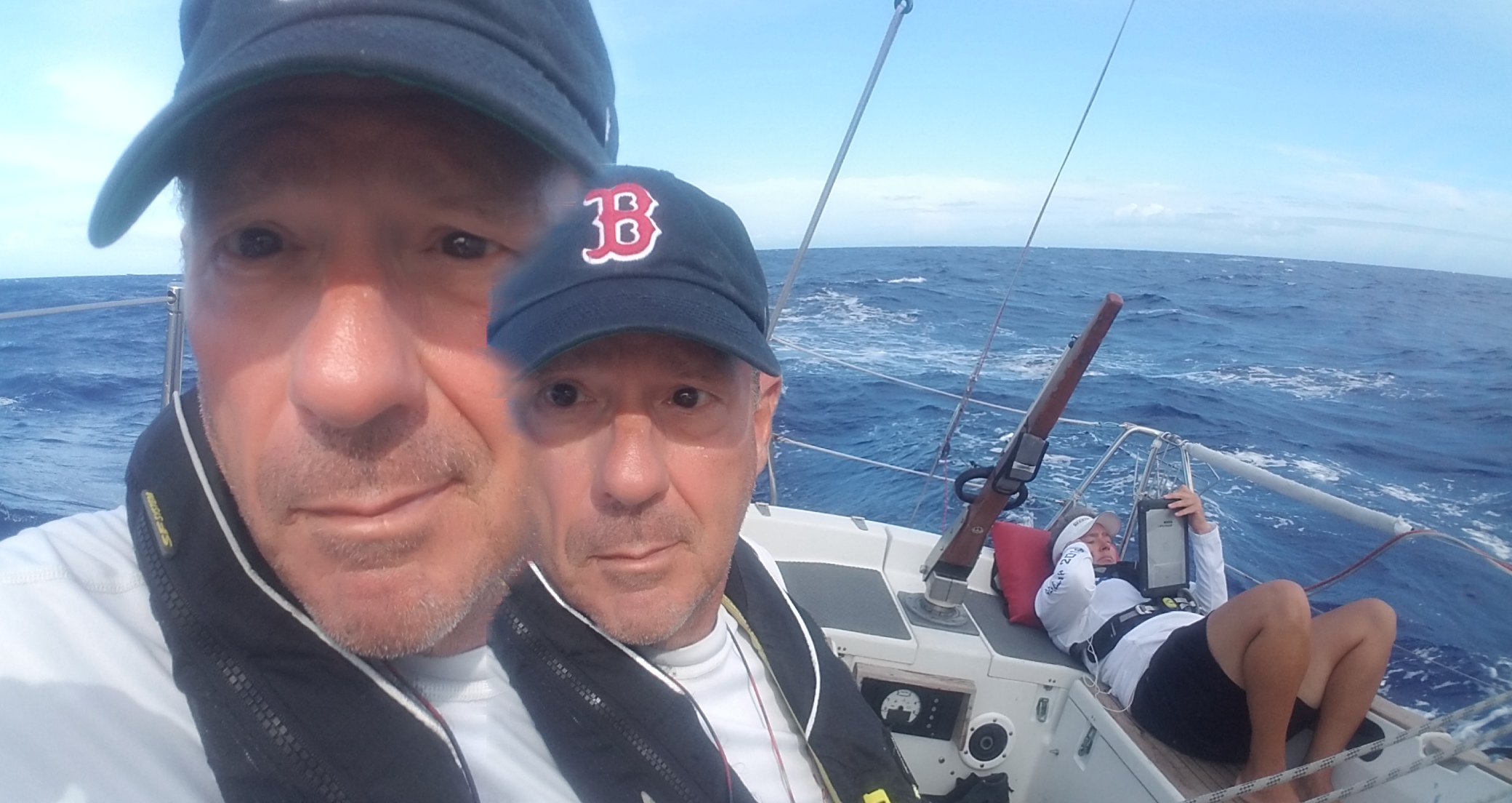 We decided to sail off the anchor. We raised the sail, but only half way. Avion is a dynamic boat; she wants to move. The current was strong, and with a 24 knot wind gust, she surged forward against the anchor line. We had not raised the sail fully, so the boom was low and swinging in the cockpit, and at some point bumped Megan in the head (her Red Sox hat protected her). I was unable to pull up the anchor, and had to wait and be patient. After a couple of minutes, the wind let up just enough to relax the anchor line, and I was able to quickly pull it up and secure the anchor. We were under way.