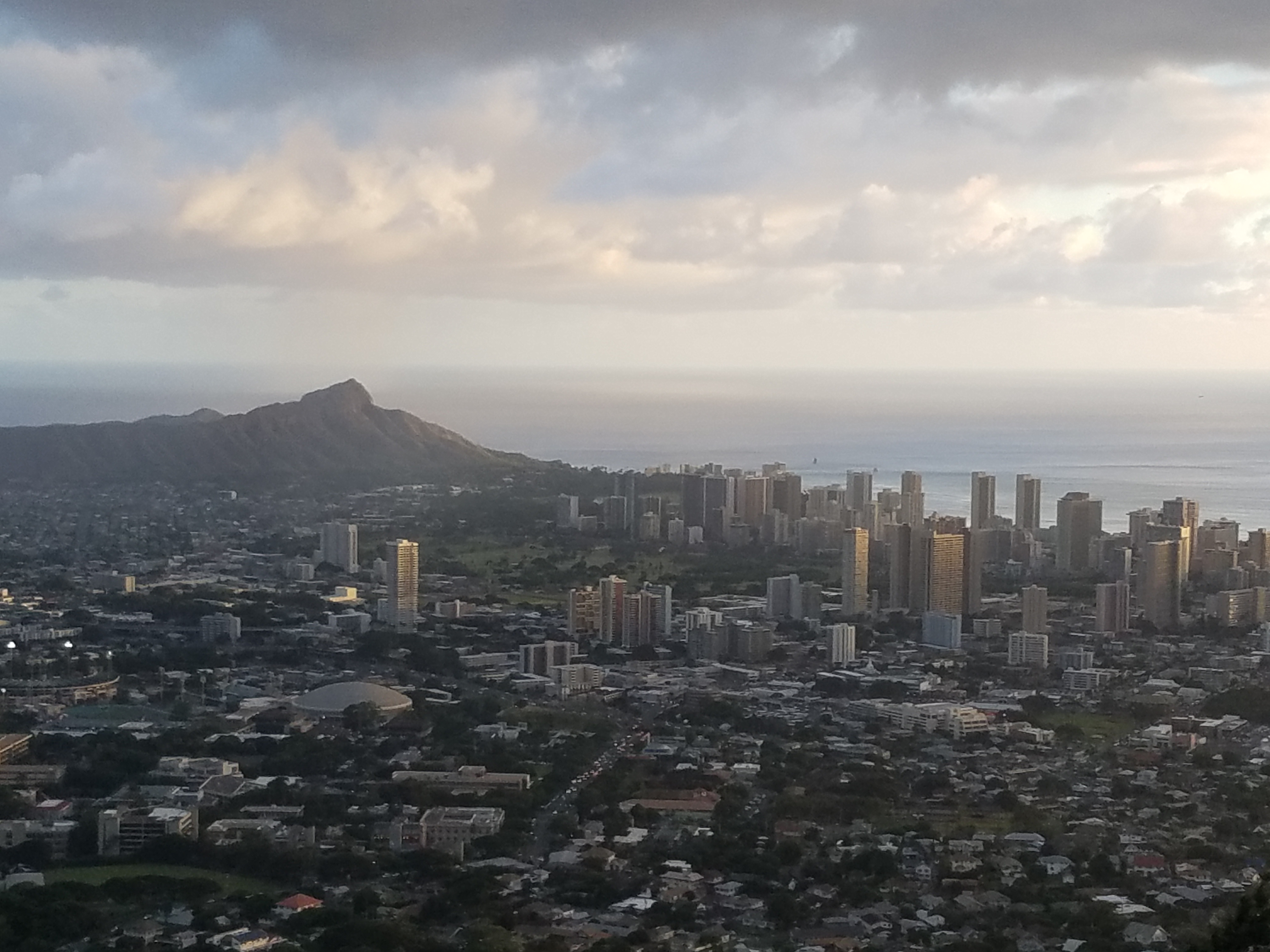 A few days later we drove up to a park over Honolulu on Tantalus Drive. The Park had a big panoramic view from Koko Head to Honolulu Airport, more than 180 degrees. We got there right at sunset.