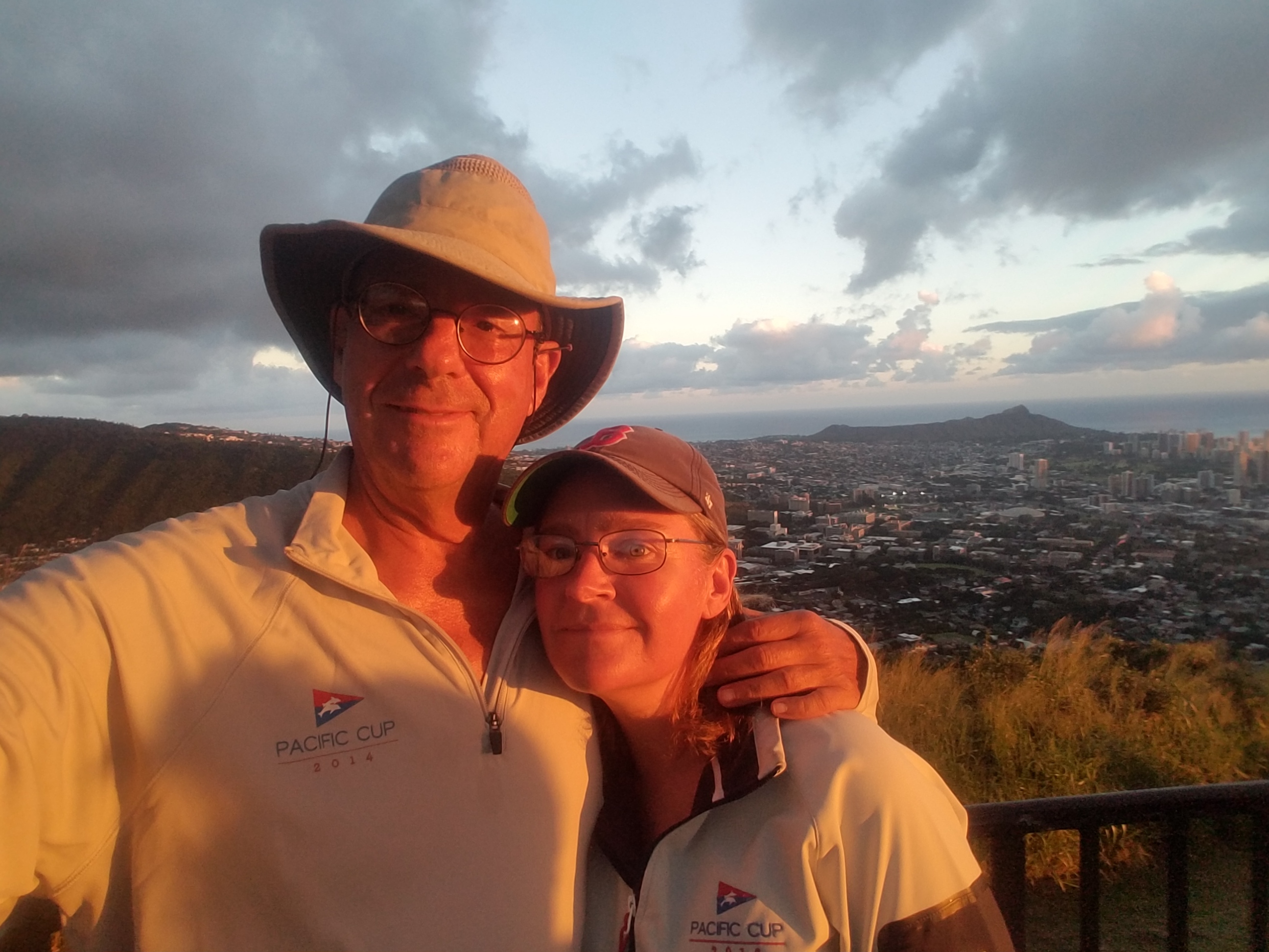 We have moved to a new slip on a different dock in the Kewalo Harhor, E-215. There are several liveaboards around us. One of them, Rene had a birthday and invited us out for a short sunset sail out the Kewalo Harbor channel. Tom went and had a great time driving a different boat (a ketch, big and slow to turn), with lots of room on the forward and aft decks for a party.