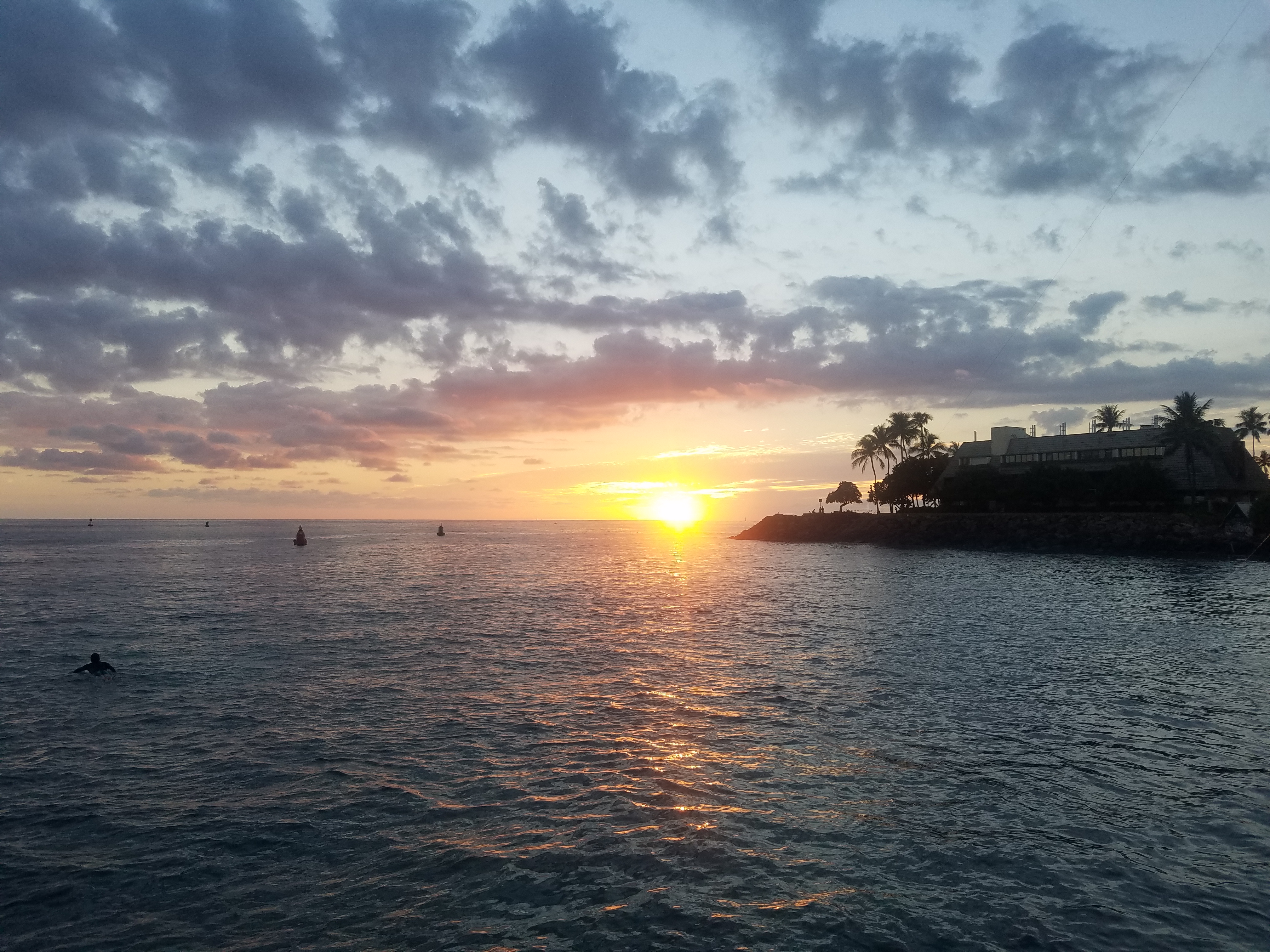 Kewalo Harboar has an active fleet of commercial fishing boats, scuba diving boats, and party boats, including a pirate boat. When a fishing boat comes in with a big marlin or some tunas, we often stop and ask questions about what they used to catch the it. We also like to take walks in the early evening to see the sunset. The sunsets at the west end of Ala Mona Park, at the entrance to Kewlao Harbor, are pretty good.
